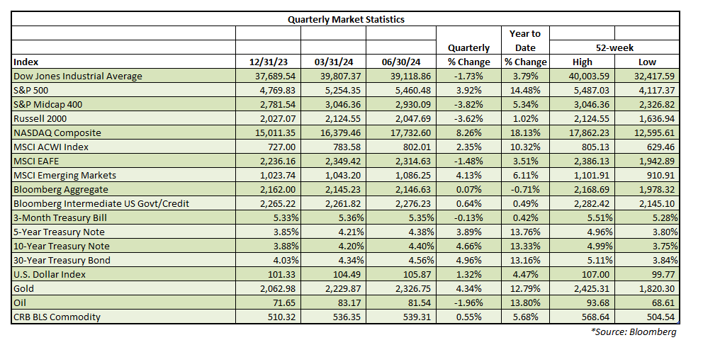 The Russell 2000 Index and the S&P Midcap 400 were down between three and four percent for the quarter and are up 1.02% and 5.34%, respectively, year-to-date. In the second quarter, investors gravitated to large-cap domestic stocks with artificial intelligence exposure. International stocks lagged the S&P 500. The MSCI EAFE Index fell 1.48% in the quarter while the MSCI Emerging Markets Indices returned a respectable 4.13%.