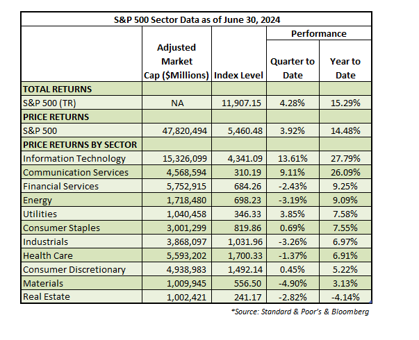 The second quarter saw solid gains for equities, completing an impressive first half performance for the S&P 500. The information technology and communication services sectors continued to lead the market higher. These sectors were the two best performing sectors in the second quarter and through June 30th. They returned more than twenty-six percent through the first half of the year. Every other sector in the S&P 500 underperformed the index through June 30th. This was in large part due to the declines seen in six of the eleven sectors during the second quarter.