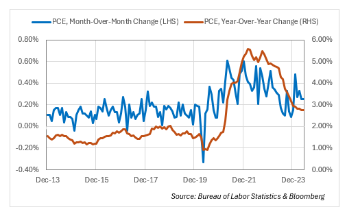 There are signs that the economy is slowing. The Bureau of Economic Analysis reported that real GDP grew 1.4% in the first quarter of 2024 after growing 2.5% in 2023. The Atlanta Fed GDPNow GDP Forecast currently sits at 2.25%. The job market, while still strong, is less strong as job openings, average hourly earnings, and monthly changes have moderated. Nominal consumer spending growth is back near its long-term trend.